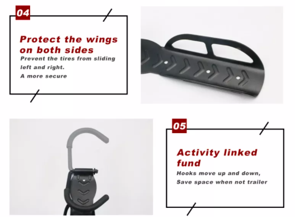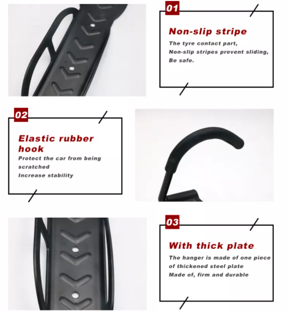 | Product Features | 1.Hook with protective sleeve to protect your bikes out of scratch. 2.The combination of hooks and bolts can firmly screw hook to the wall and prevent the bikes from falling. 3.Save Your Space. Vertical bike holder set-up saves space. Ideal to use for hanging bicycles, power equipment, furniture, tools,etc. 4.Easy to install. When using our bike wall mounts, make sure to install in a tough wall to ensure the hook stay firm. 5.The bike hooks are perfect for all bike types, including road, mountain, hybrid, BMX, cross, trials, fitness and kids bicycles. 6. load capacity up to 30kg.